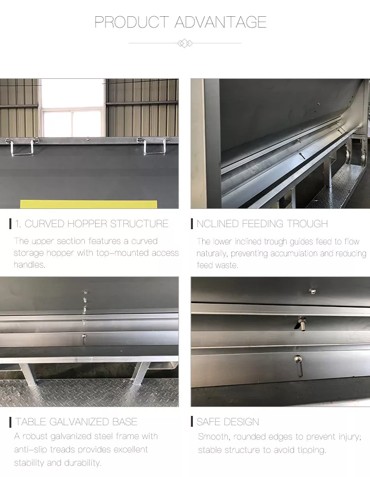 2. ညီညာသောအစာကျင်း- အောက်ဘက်စောင်းထားသောကျင်းသည် သဘာဝအတိုင်း စီးဆင်းစေရန် လမ်းညွှန်ပေးသည်၊ စုဆောင်းမှုမှကာကွယ်ကာ အစားအစာစွန့်ပစ်ပစ္စည်းများကို လျှော့ချပေးသည်။